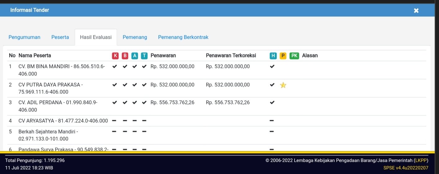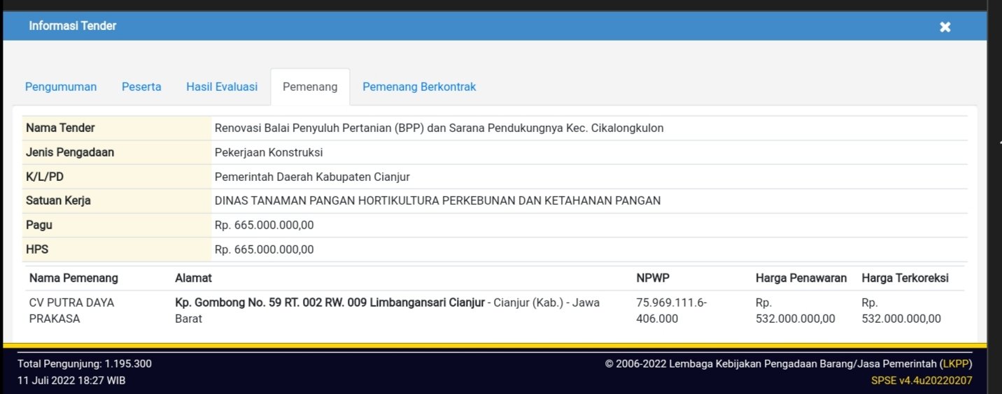 Berdasarkan informasi laman LPSE Kabupaten Cianjur, Senin (11/7/2022) pukul 18.00 Wib ketiga rekanan yang harga penawarannya sama itu antaralain; CV Putra Daya Perkasa, CV Bina Mandiri dan Sultan Jaya Grup.