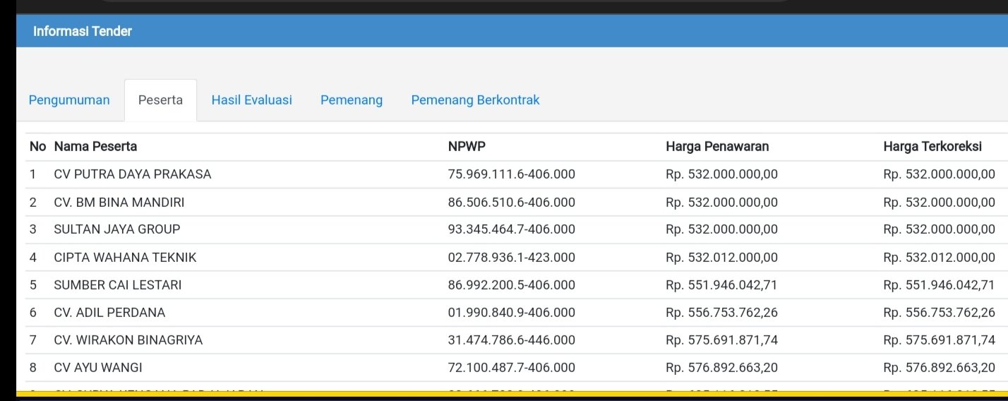 Pasalnya tiga rekanan peserta tender didapati membuat harga penawaran yang nilainya sama persis yaitu Rp. 532.000.000.
