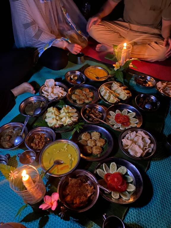 Tidak ada listrik, hanya cahaya lilin. Makan malam disajikan dengan sangat melimpah: ayam kecap, perkedel jagung, orek tempe, semur telur, opor ayam, kerupuk, teh hangat, dan kopi hitam. Kami makan bersama para guide, bercengkrama, bermain kartu, tertawa, lalu tertidur lelap setelah hari yang panjang.