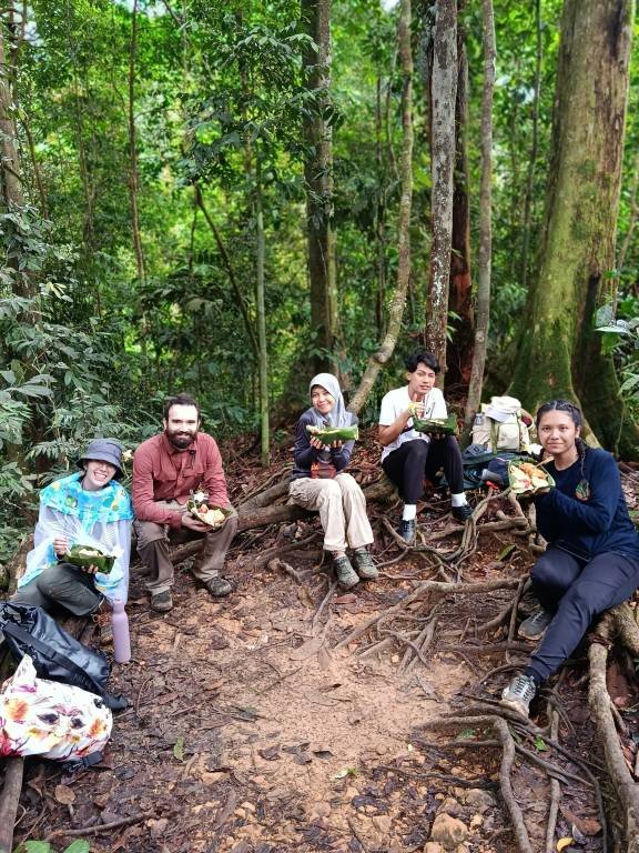 Perjalanan berlanjut semakin dalam ke hutan. Pohon-pohon besar berdiri kokoh, akarnya menjalar ke segala arah, seperti penjaga setia kawasan ini. Sekitar dua setengah jam berjalan, kami berhenti sejenak untuk beristirahat dan makan buah-buahan.
