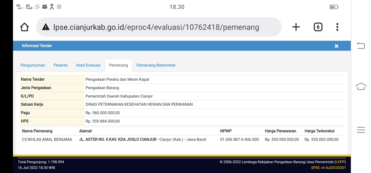 Berdasarkan informasi laman LPSE Kabupaten Cianjur, Sabtu (16/7/2022) panitia tender telah menetapkan CV Ikhlas Amal Bersama sebagai pemenang tender yang sebelumya sempat mengalami pembatalan tersebut.