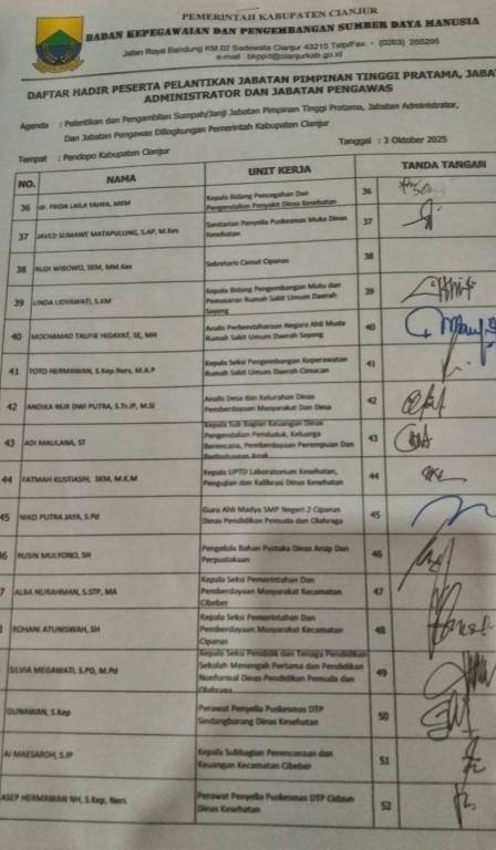 CIANJUr. maharnews.com- Puluhan pejabat Cianjur mengikuti gelar mutasi rotasi Jumat pon , 3 Oktober 2025 di ruang Garuda Pendopo Pancaniti.
